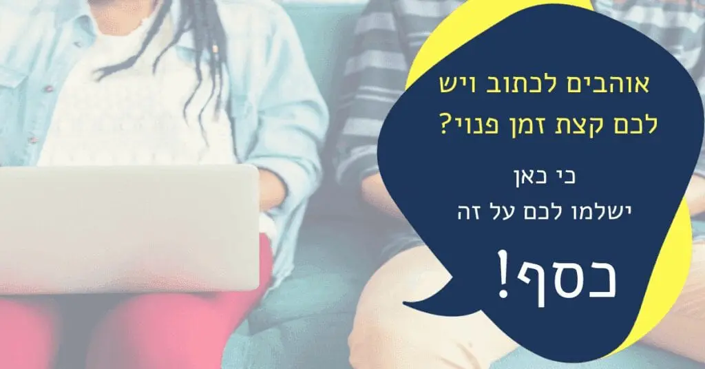 כתיבת תוכן – הרבה אתרים ובעלי עסק מחפשים כותבים תוכן שיבנו להם מאמרים או כתבות בשביל האתר אם אתם אוהבים לכתוב ויש לכם קצת זמן פנוי בכל יום שבא לכם לנצל אותו , אתם מחפשים אנשים שמחפשים תכנים או מפרסמים את עצמכם באינטרנט וגובים מחיר למספר מילים של תוכן, אם אתם אוהבים לכתוב אז העבודה הזו היא בשבילכם !